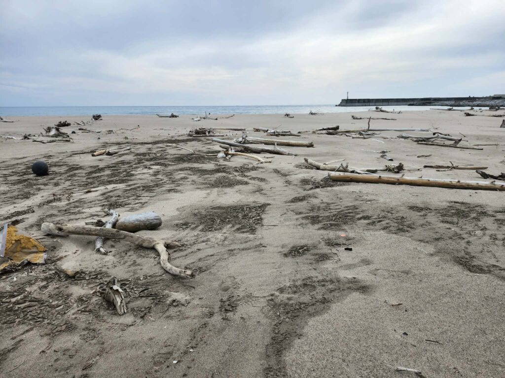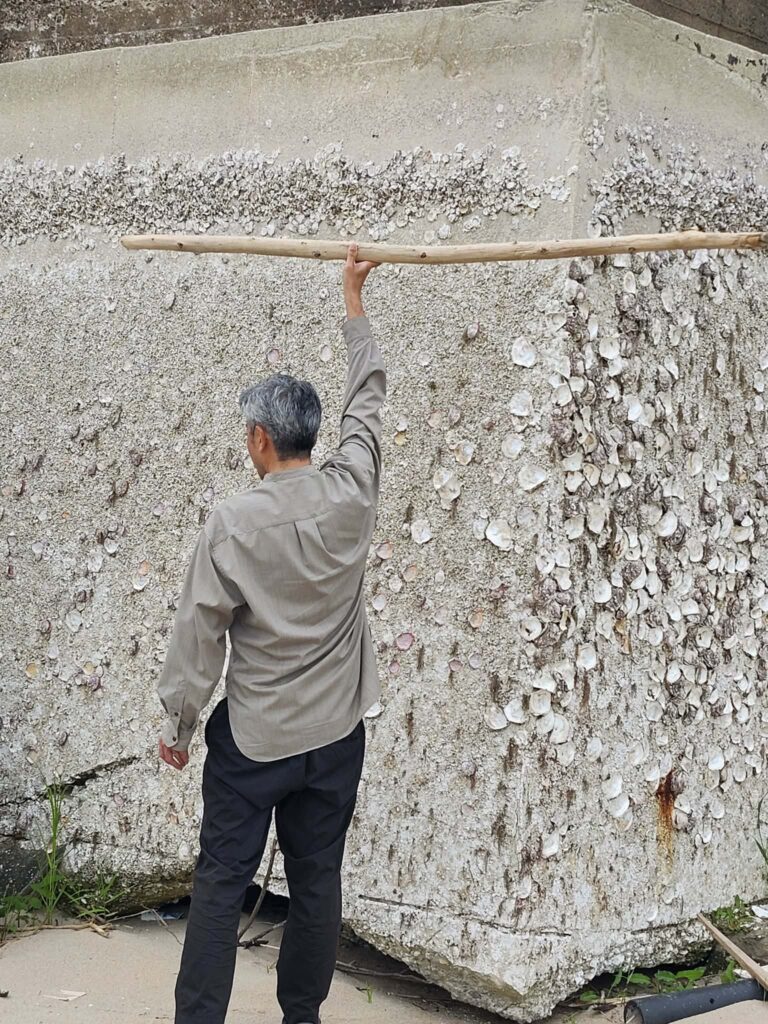 能登の震災ということは全面に出していませんが、地震で隆起して使えなくなった港に打ち上げられた流木たちがこうして日の目を見るということはアップサイクルの一環でもあります。こちらの写真を見て頂ければわかる通り、2メートル以上隆起しており、本来は人が腕をあげた高さ以上の貝のついているところまで、海がありました…